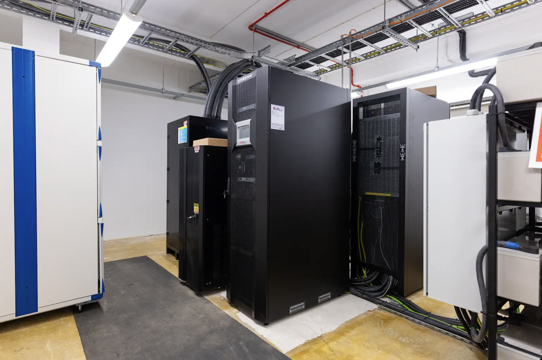 - Power resilience: Dual UPS systems, dual power feeds to each rack, and a dedicated 500kVA generator with 48-hour fuel capacity.